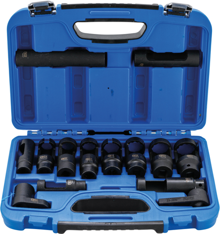 Universal kit for Lambda sensors, chrome vanadium steel, additionally annealed for passenger cars, commercial vehicles, entrance 1 / 2 6 - and 12-point, length 30 - 150 mm, the probes: Bosch, General Motors, Mercedes-Benz Volvo, Scania, HGV, Ford, VAG, BMW, Fiat, Peugeot, Citroen, Audi, VW, Seat, Renault,